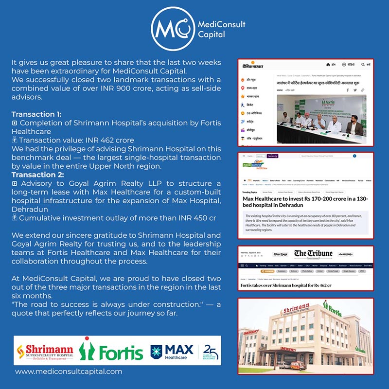 We are advising a leading North India based hospital owner to acquire a 400-bed multispecialty hospital in a North Indian capital city